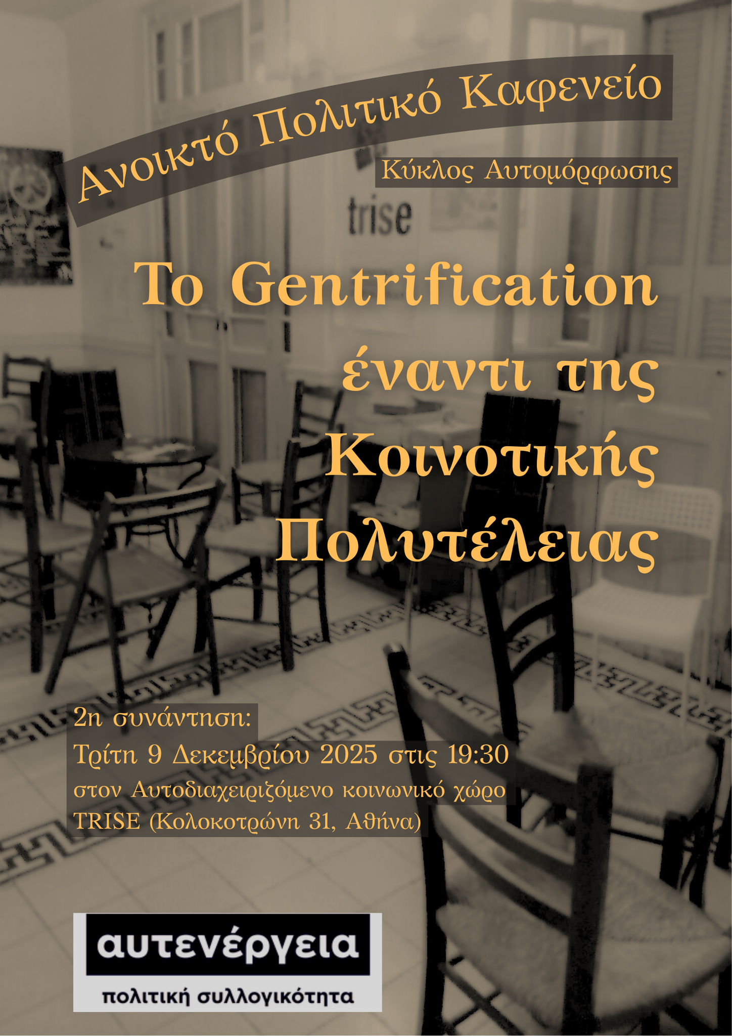 Πολιτικά καφενεία – 2η Συνάντηση 9/12: “Gentrification έναντι Κοινοτικής Πολυτέλειας: Εμπειρίες και μαθήματα από τα κινήματα”