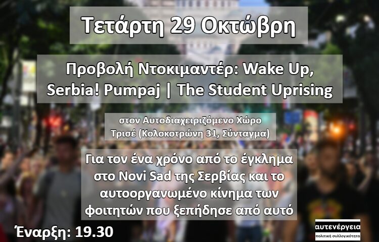 ΤΕΤΑΡΤΗ 29 ΟΚΤΩΒΡΗ, ΠΡΟΒΟΛΗ: WAKE UP, SERBIA! PUMPAJ – 1 χρόνος από το Νόβι Σαντ